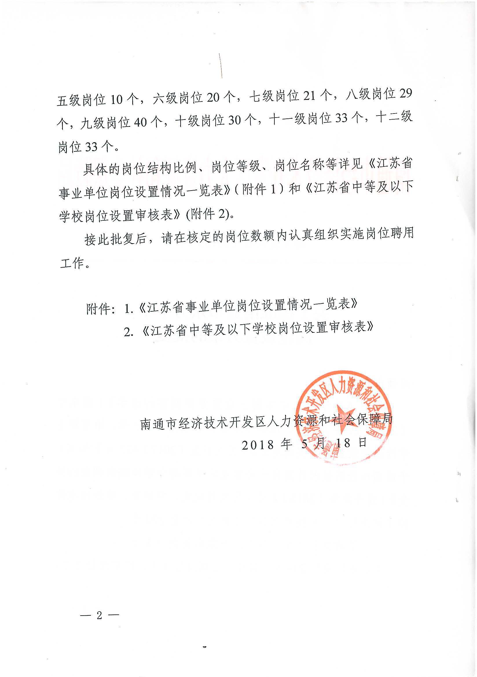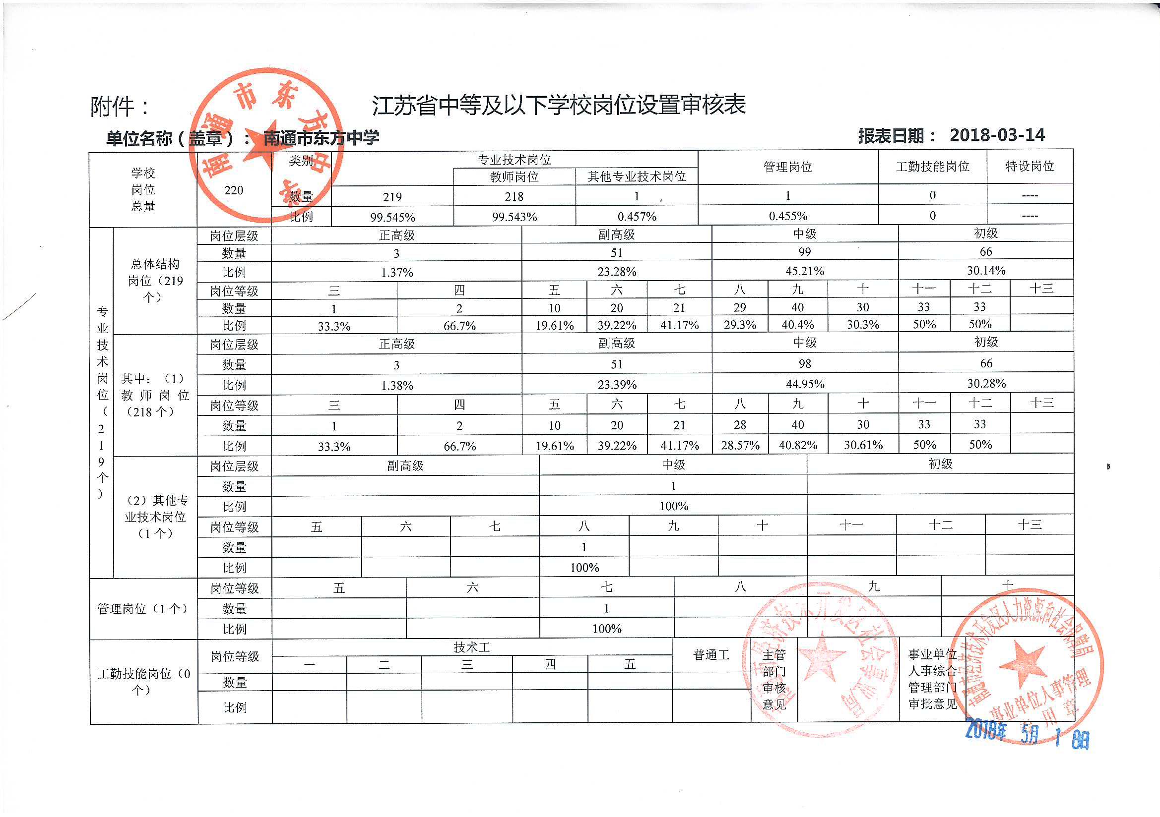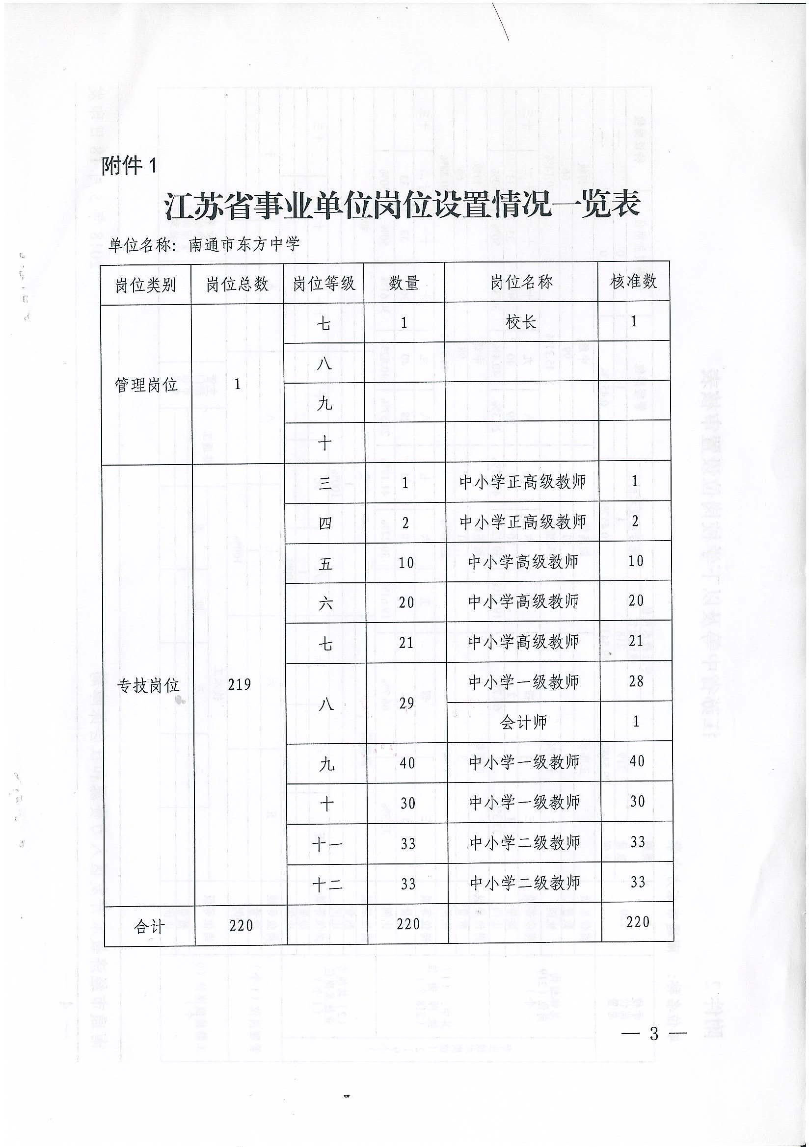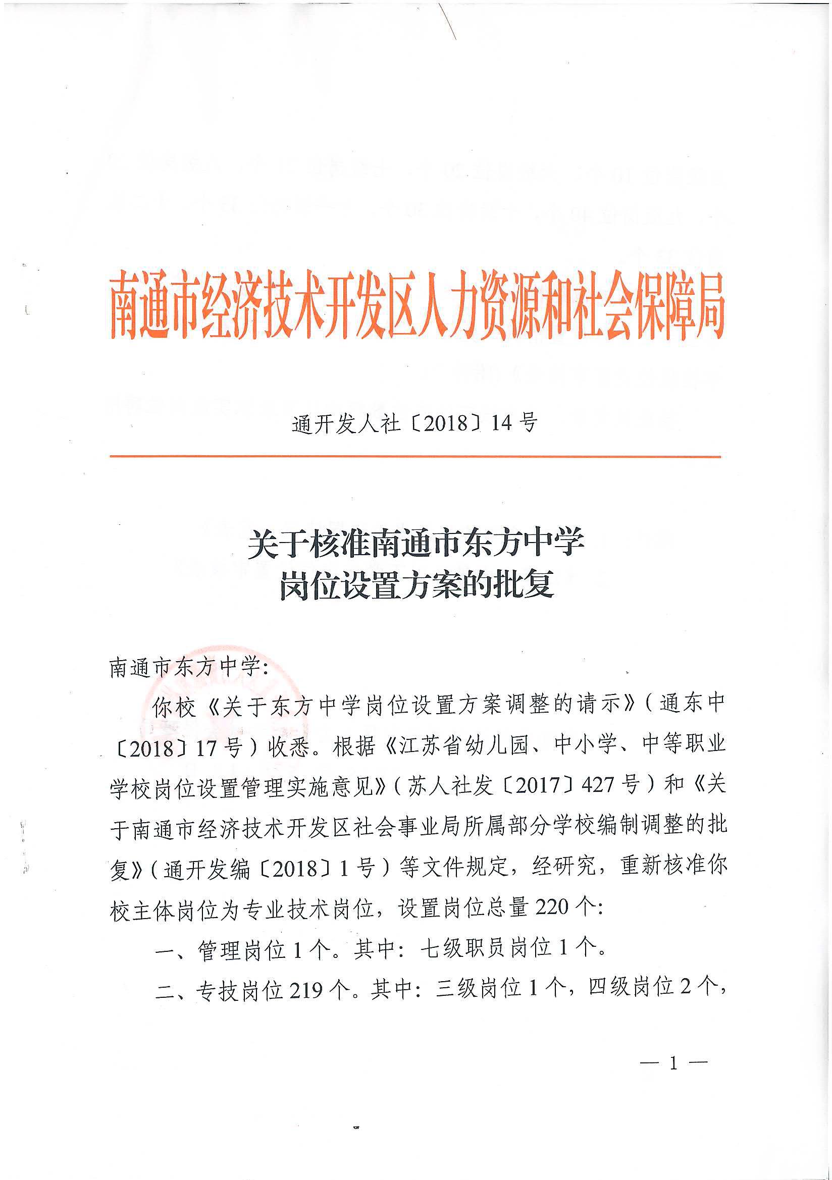 关于核准南通市东方中学岗位设置方案的批复