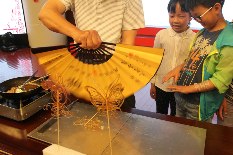拿一把小勺、一个小铲,以“长勺为笔,糖汁为墨”,就在泼泼洒洒间,缕缕糖丝在石板上来回飘洒,不一会儿花草树木,飞禽走兽栩栩如生地展现在了大家面前。当造型完成后,随即用小铲刀将糖画铲起,粘上竹签,一个生动的糖画便完成了,大家无不为之惊叹,场上响起了热烈的掌声。