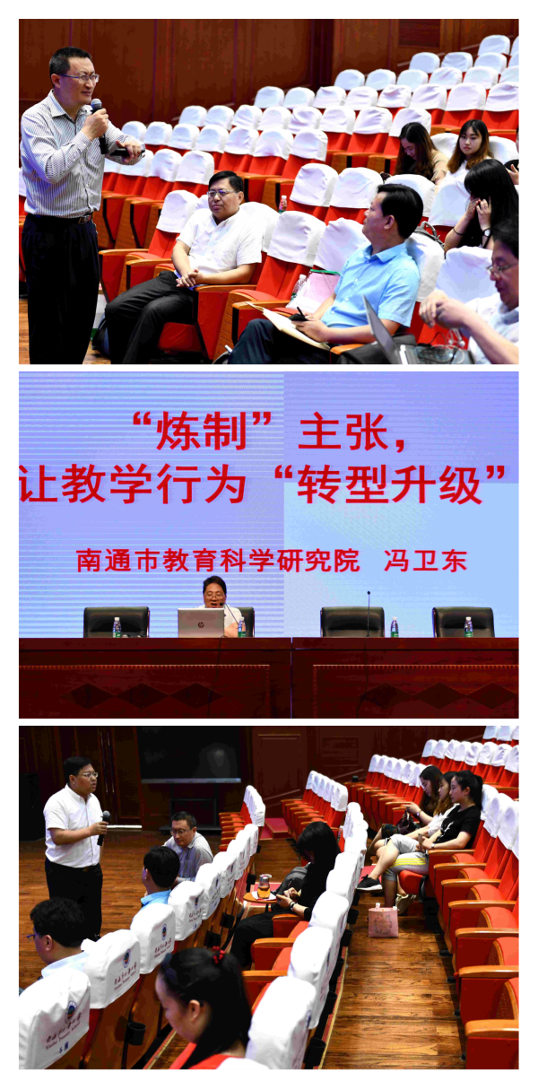 观摩课结束后,南通市教育科学研究院理论科科长周荣斌向老师们分享了他听课后的一些思考。周科长认为,教师应让课堂教学的过程成为教研生长的过程,要让我们的课堂真正成为精彩的课堂。接下来,南通市教育科学研究院的冯卫东主任做了题为《“炼制”主张,让教学行为“转型升级”》的专题报告。冯主任从“教学主张是什么”、“为什么要‘炼制’教学主张”和“怎样来‘炼制’教学主张”三个方面向老师们阐述了他的教学理念。冯主任的报告语言精练,让老师们受益匪浅。最后,南通市教育科学研究院理论科副科长邢晔做了总结发言。邢晔科长要求老师们要从课堂抓起,勉励大家在打造精品课堂上多下功夫。