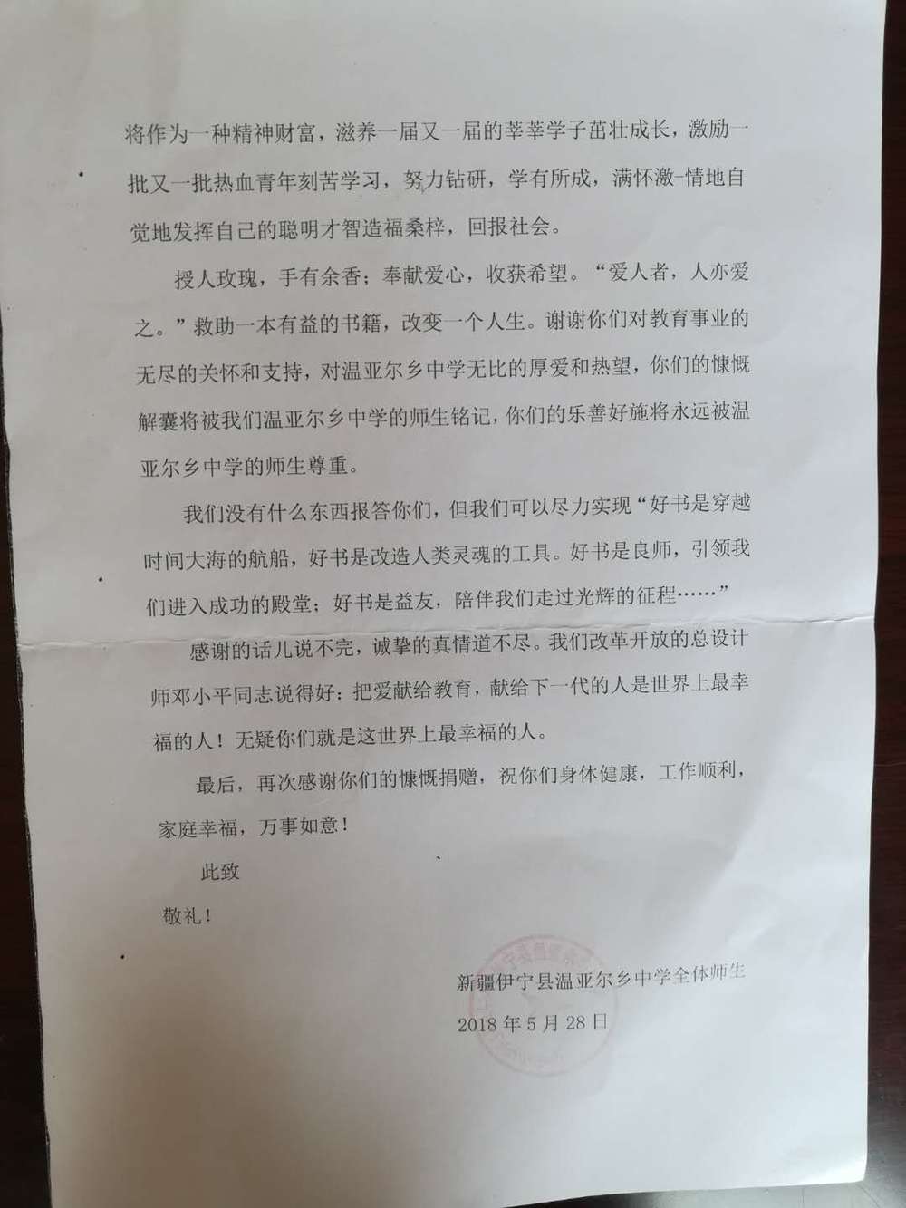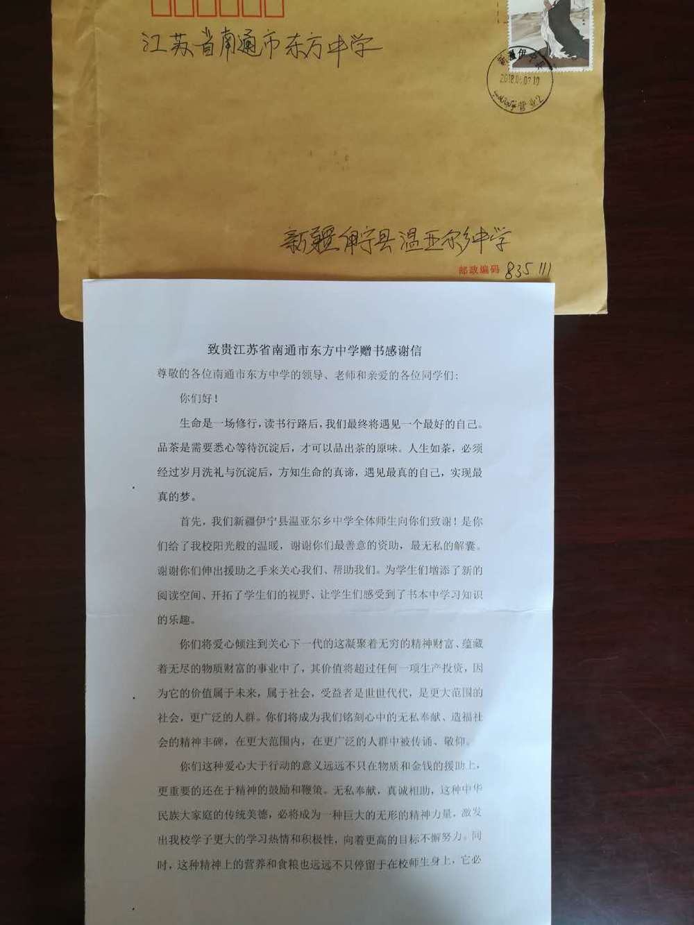 南通市东方中学收到新疆伊宁县温亚尔乡中学爱心赠书感谢信