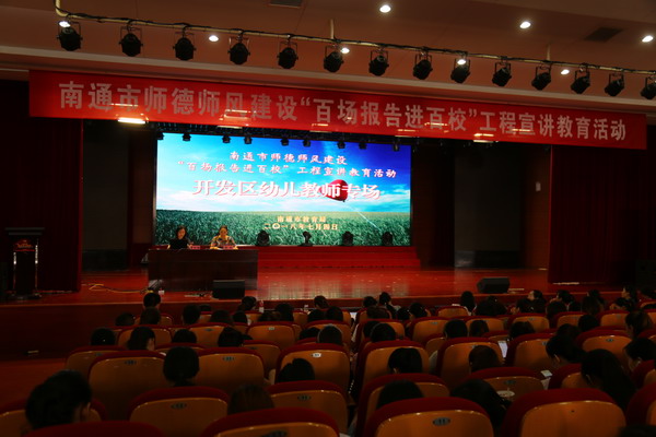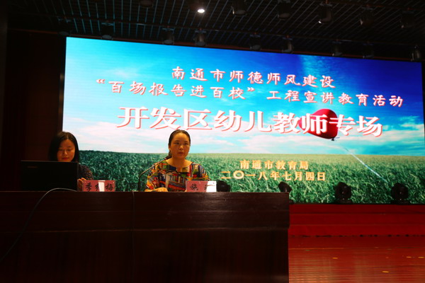为弘扬师德精神,加强教师师德建设,2018年7月4日下午,南通市“师德师风百场报告”进开发区首场幼儿教师专场在开发区实验小学新河校区报告厅举行,全区21所幼儿园共500余名幼儿教师参加了活动,社会事业局幼教专干施玲老师全程组织。