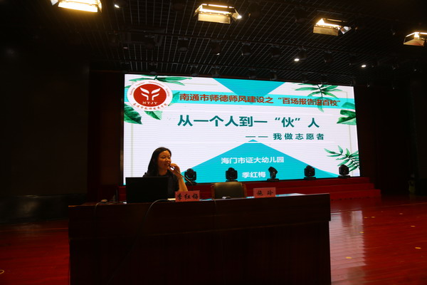 本次活动以加强师德师风建设,做新时代党和人民满意的好老师为主题,特邀海门市证大幼儿园园长、南通市骨干教师、南通市优秀班主任、海门市优秀巾帼志愿者季红梅老师做了《从一个人到一“伙”人——我们做志愿者》专题报告。开场前,来自海门男幼师的热场律动“海草舞”带动了整个会场气氛,接着季园长深入浅出地阐述了师德的定义及特点,然后她从“前言”、“走远——一群人合伙”、“留驻——心与心的融合”等方面介绍了全国新教育萤火虫亲子共读公益项目组的组织架构和动人故事,诠释了她们“点亮自己,照亮他人”的公益活动初衷,引导教师专注专业、精诚合作、开放成长,要把心门打开,让爱住进来,心中有爱,不管什么事情都能完成。