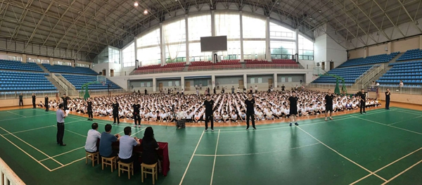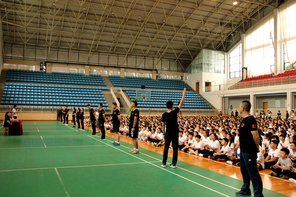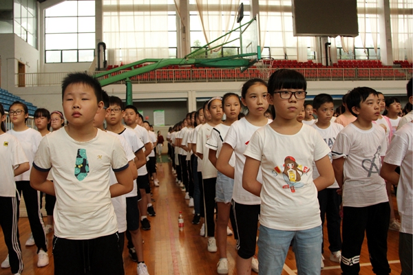 8月26日上午8:30,在东方中学体育馆,2018级初一年级全体师生举行了隆重的开营仪式。出席开营仪式的有蒋子平、顾建兵副校长,以及初一年级组各位分管领导。仪式由政教处黄杰主任主持。蒋子平副校长代表学校领导发表了热情洋溢的讲话,他对东方中学注入的新鲜力量表示热烈的欢迎,希望孩子们利用好此次的机会尽快适应初中生活,刻苦学习,争做全面发展的好学生。黄杰主任宣布了此次活动的14名教官的名单,对参加此次活动的24位班主任和全体学生提出了明确的要求。李嘉诚老师代表教官和对同学们提出了军训具体的要求。