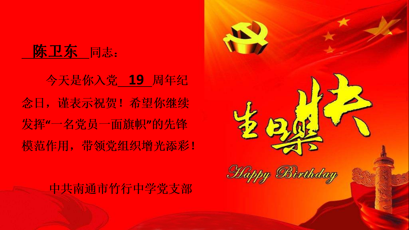 党员被党支部通过其为预备党员的那一天起,每名党员便开始拥有了自己专属的“政治生日”。“政治生日”意味着党员对于自己终生信仰的抉择。本季度过“政治生日”的党员同志是陈卫东书记,党支部也对陈卫东同志赠送了良言诤语。