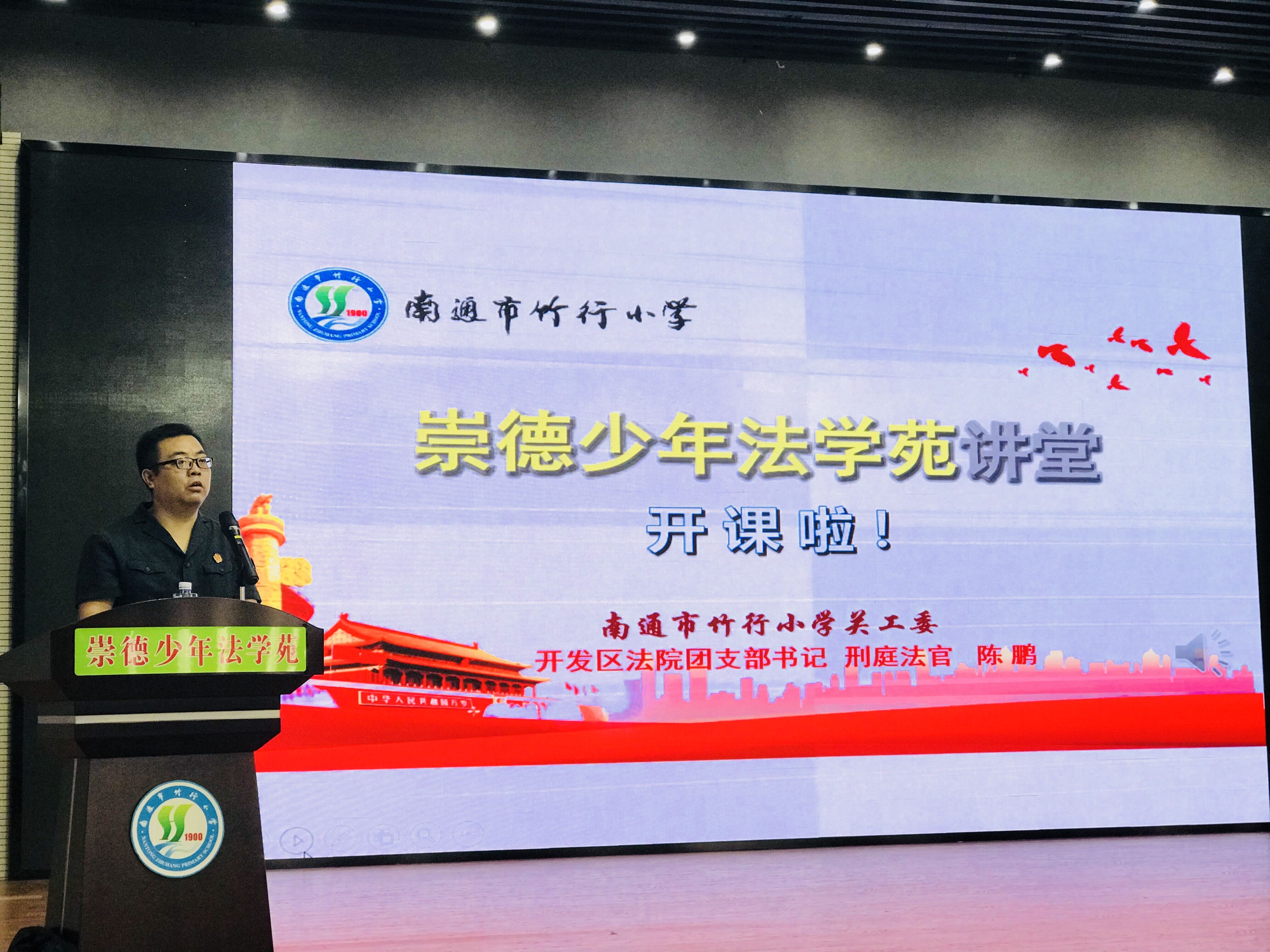 9月11日上午,竹行小学“崇德少年法学苑”第一课开讲了。南通开发区法院团支部书记刑庭陈鹏法官应邀为全体六年级学生做了一场生动精彩的普法专题讲座。