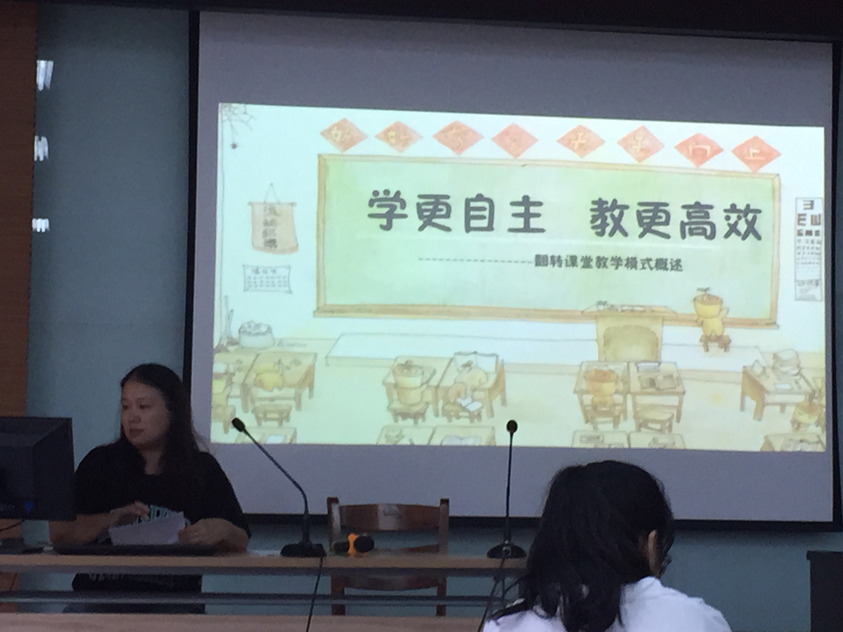 首先,六年级的倪燕老师为大家做《学更自主、教更高效——翻转课堂教学模式概述》的专题讲座。倪燕老师具体围绕翻转课堂是什么、翻转课堂的误区、翻转课堂的起源、翻转课堂的特点、翻转课堂的开始、翻转课堂如何改变学习等六个方面简洁而又全面地介绍了翻转课堂教学模式。倪老师还结合自身在日常教学中应用翻转课堂模式的实践,向大家分享了一些教学小妙招。老师们聆听之后受益匪浅。