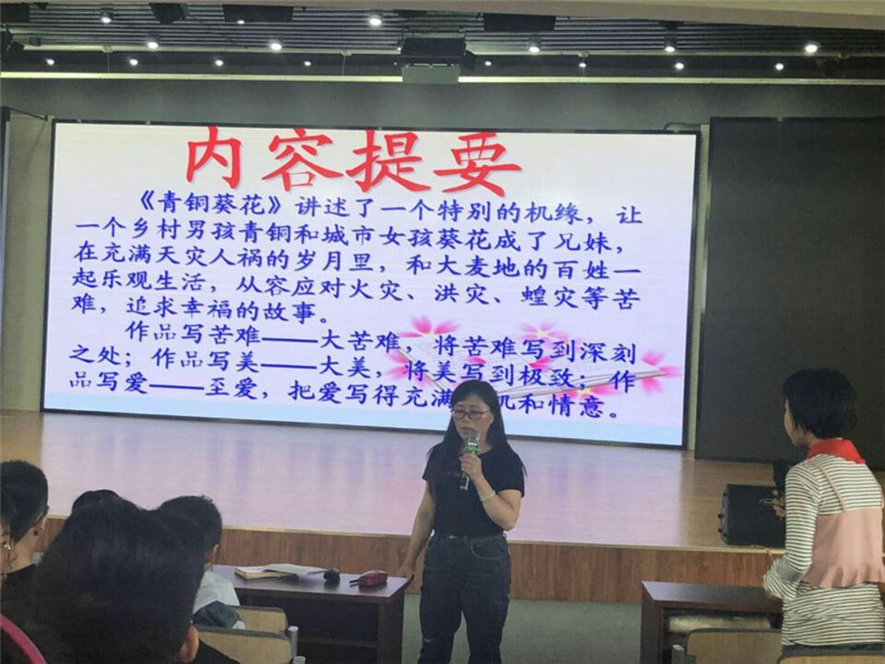 2018年10月10日中午,杨跃兰老师甘作经典推广人,借《青铜葵花》的阅读推介,把曹文学的纯美系列作品一一介绍给学生。杨老师由作家卡片入手介绍曹文轩,激起学生心中的仰慕之情。接着给学生介绍了解故事的最佳方法。然后抓住 “大苦”、“大美”、“至爱”关键词,紧扣作品中能打动读者心灵的片段,带领六年级学生一起阅读。在欣赏、品读、质疑中激发学生阅读的愿望,在师生的互动交流中,杨老师不知不觉将同学们带入故事的情节中。