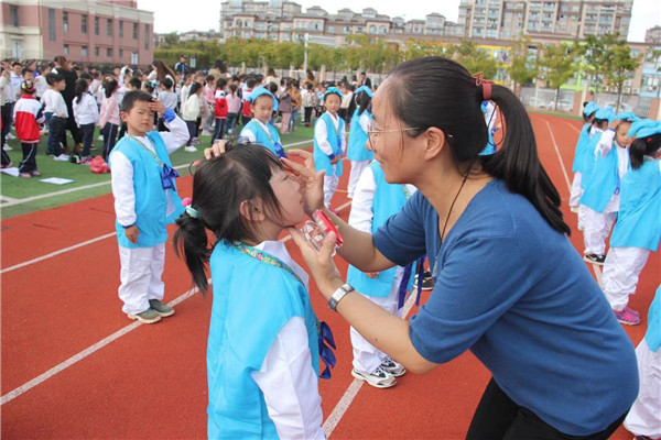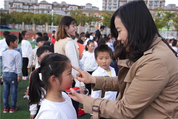 “朱砂启智”又称“开天眼”,意为开启智慧,以此寄托美好的愿望,从此眼明心亮,好读书,读好书。老师们在小朋友们的额头正中点上红痣,一颗颗红痣饱含着父母、长辈、学校的美好祝愿。
