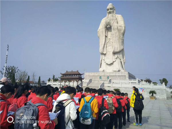 一下车映入眼帘的便是孔子的石像,热心的讲解员姐姐告诉我们,孔子石像底座高5米,孔子像全长27米,一共32米,第一次看到这么高大威武的孔子石像,大家驻足凝视,怀着对孔子的崇敬之情,六年级各班纷纷在石像前拍照留念。
