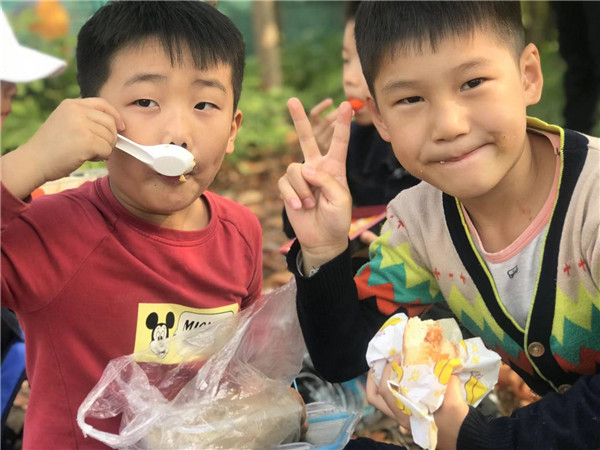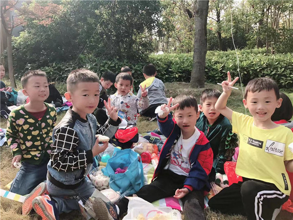 沐浴着秋日的暖阳,呼吸着香甜的空气,聆听着小鸟的啾啾声,孩子们纷纷拿出自己事先准备好的餐布铺在地上,准备分享美食啦!各种各样的美食一齐亮相,大家围在一起你尝尝我的,我尝尝你的,吃到开心的时候,孩子们或手拉着手唱歌、或赛跑、或舞蹈,在他们的脸上洋溢的是快乐,是喜悦,是兴奋。他们开心地吃,高兴地聊,远远地就听到他们银铃般的笑声……临走前,孩子们也不忘做一个“环保小卫士”,将垃圾都放在各自带来的垃圾袋里,不让任何一个小垃圾污染我们美丽的啬园。