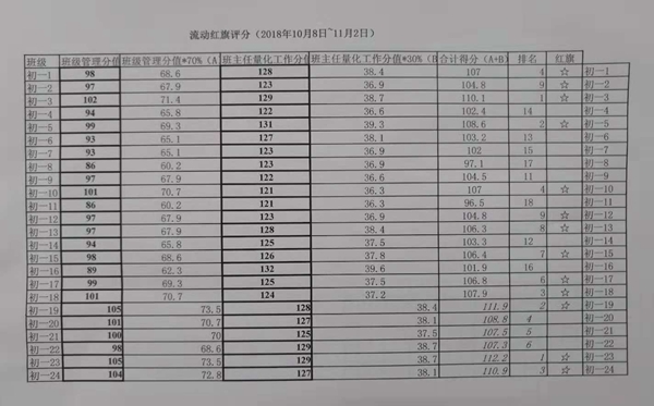 11月6日早上7:00,初一年级部召开了年级部集体晨会,通报了学校导护工作中发现的问题。同时表彰了10月份“流动红旗”获得班级。本次初一年级部24个班级中共有13个班级获得10月份的班级“流动红旗”,在此我们表示热烈祝贺!