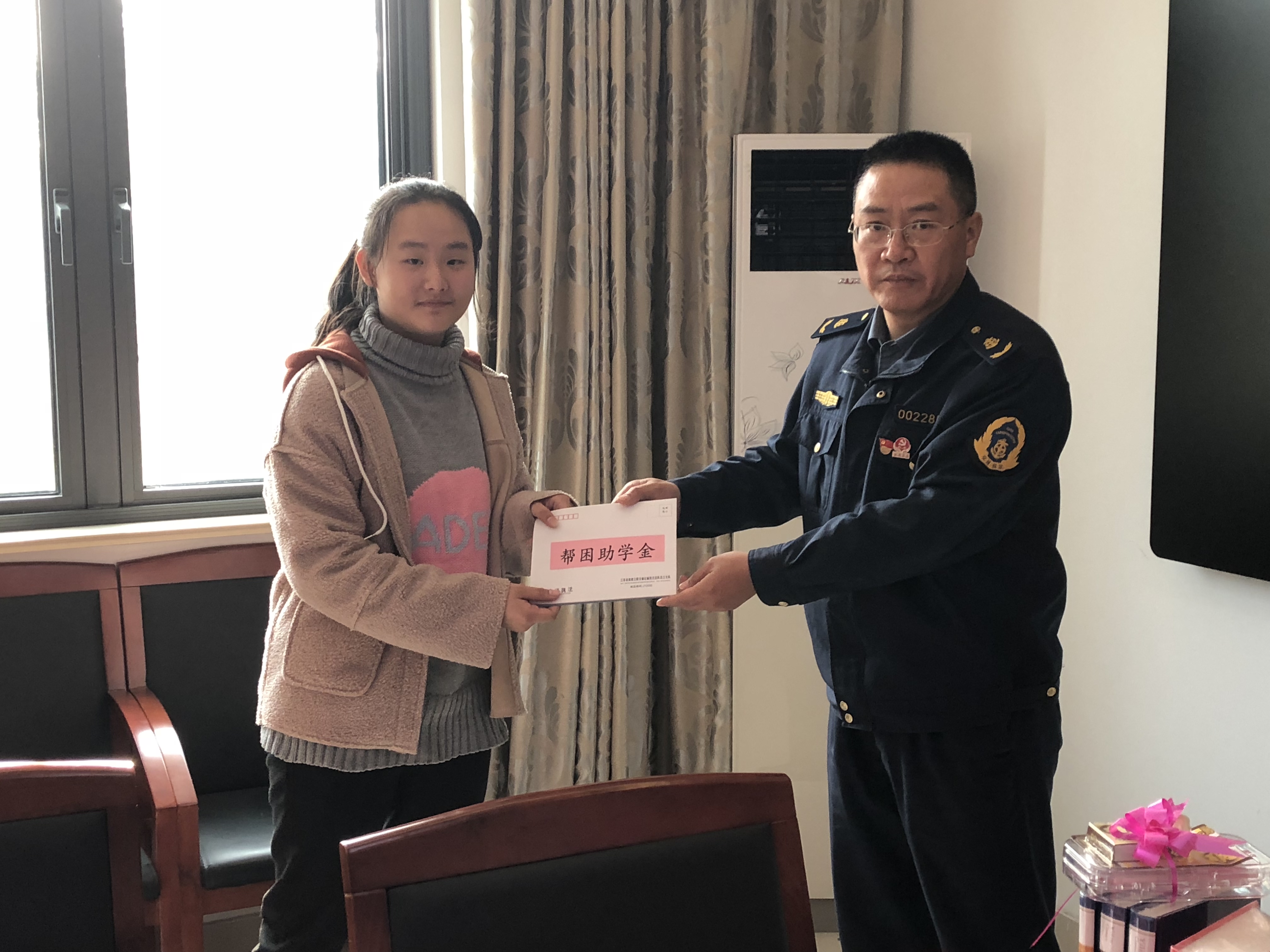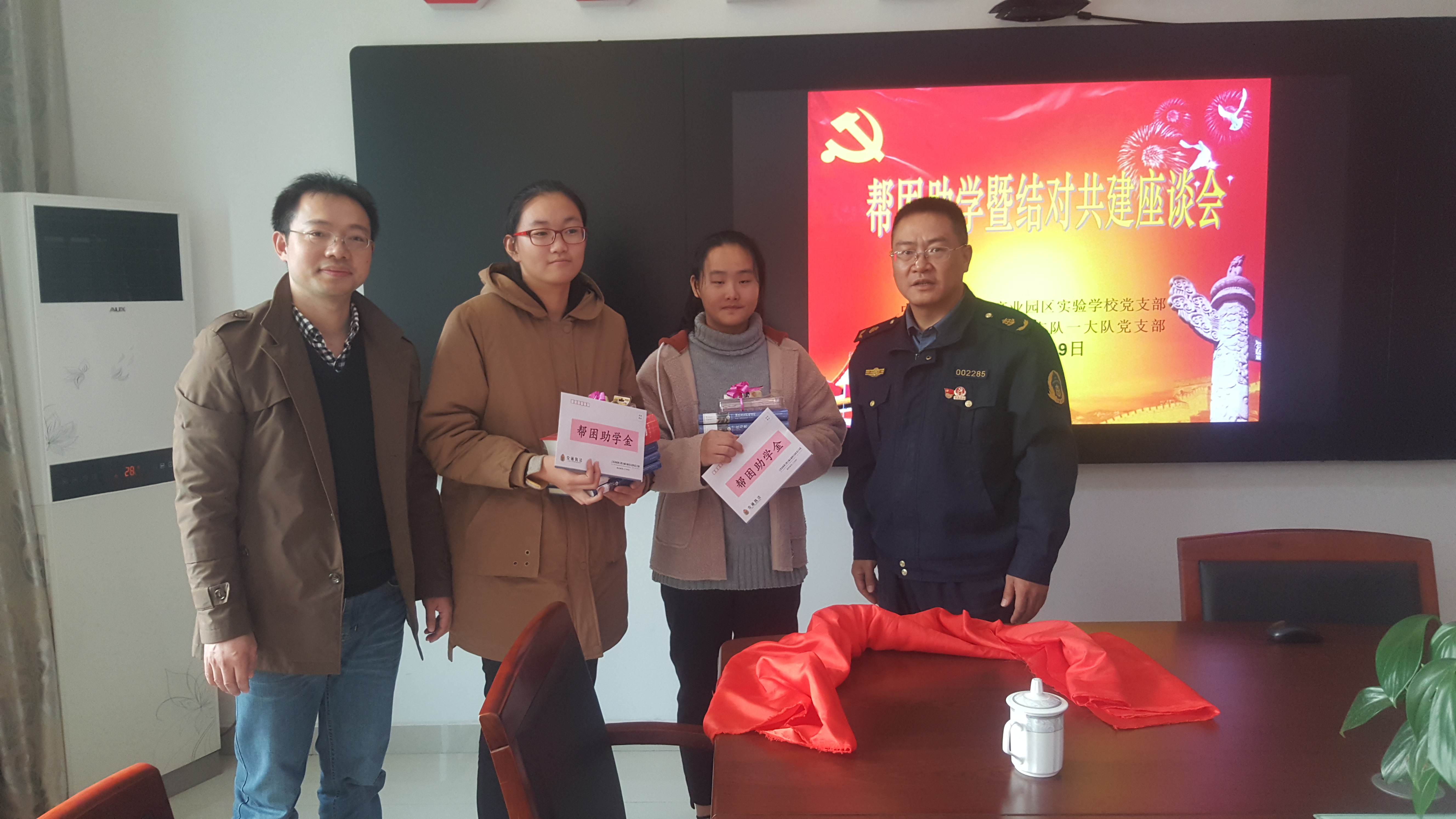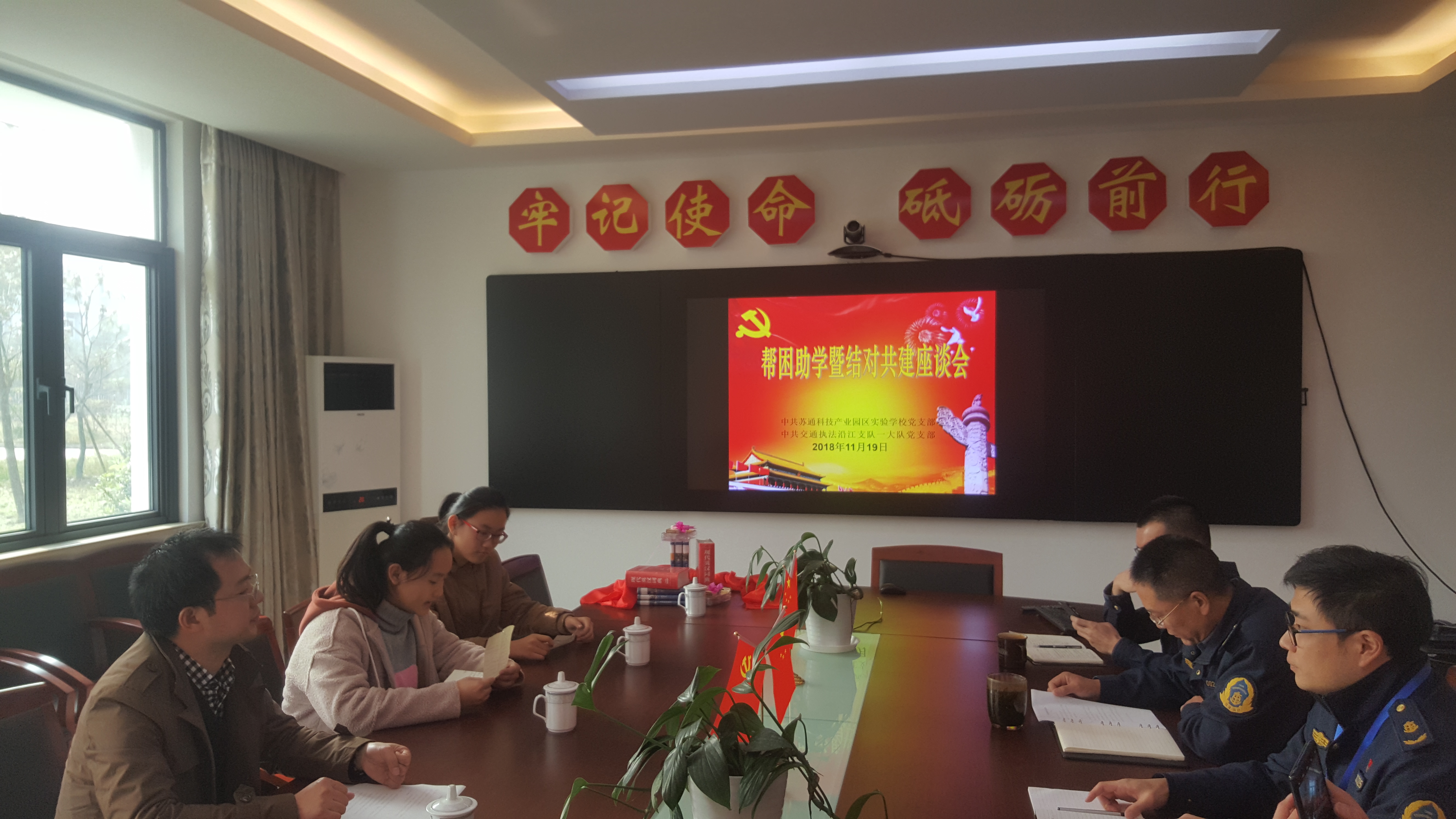 2018年11月19日,在交通执法沿江支队一大队的党员活动室,由一大队杨成俊书记主持召开了帮困助学暨结对共建座谈会,我校耿元元校长带领两位连续受资助的学生一起参加了座谈会。