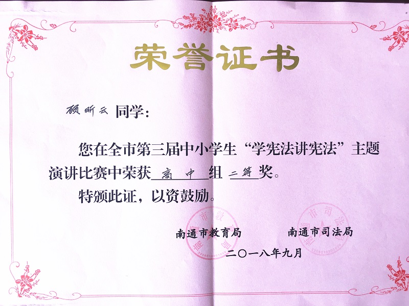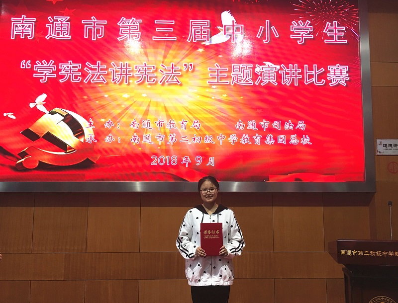 顾昕云同学获南通市“学宪法讲宪法”主题演讲比赛二等奖