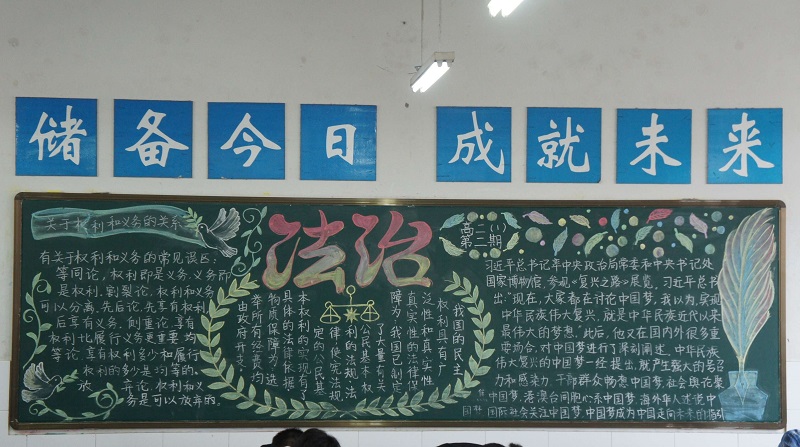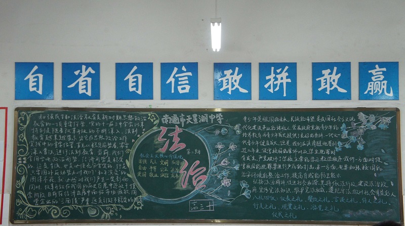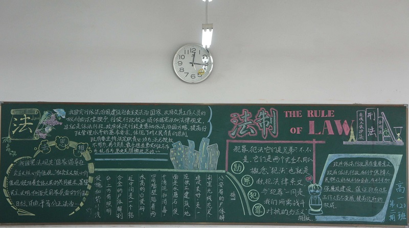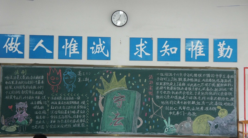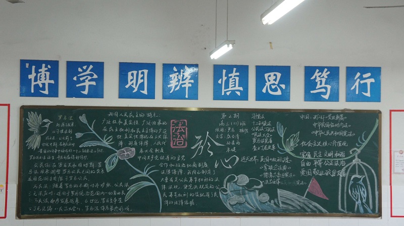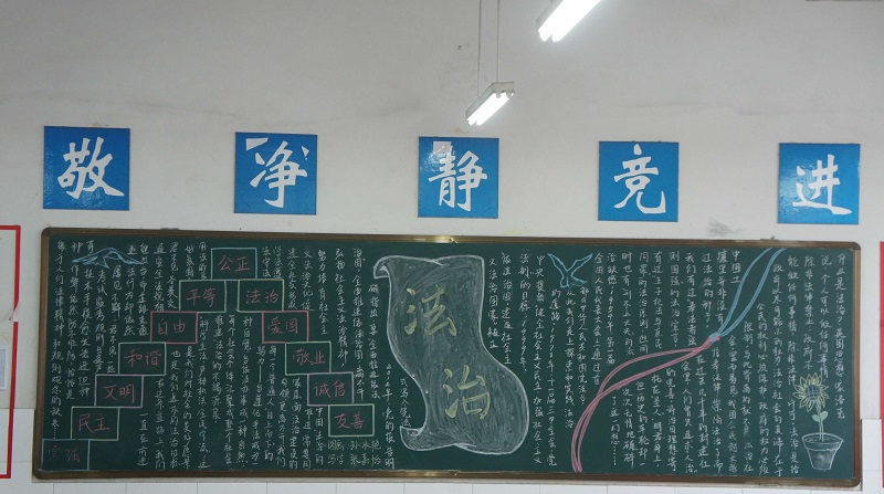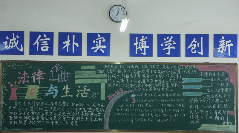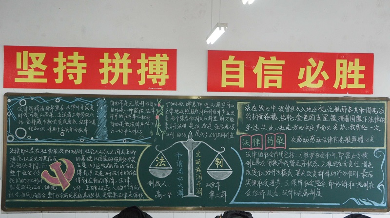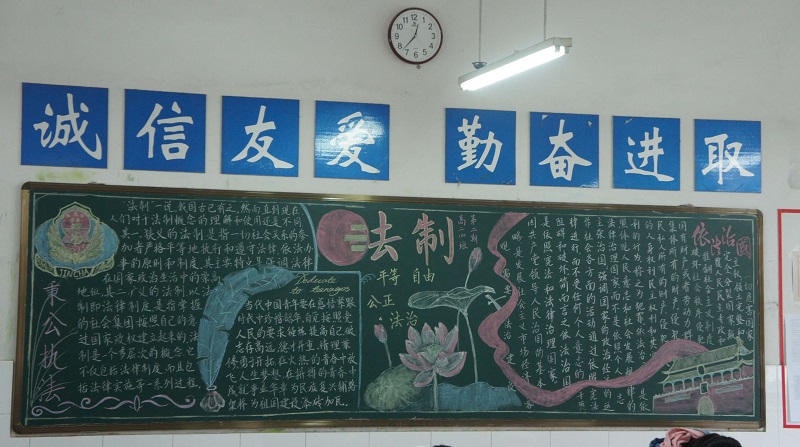 近期我校开展了以“校园法制宣传教育”为主题的黑板报评比。此次黑板报整体质量较高,各班级都能够围绕所选主题整体设计版面,图文并茂,宣传效果较好,真正起到安全法制教育“警钟长鸣”的长远效果。