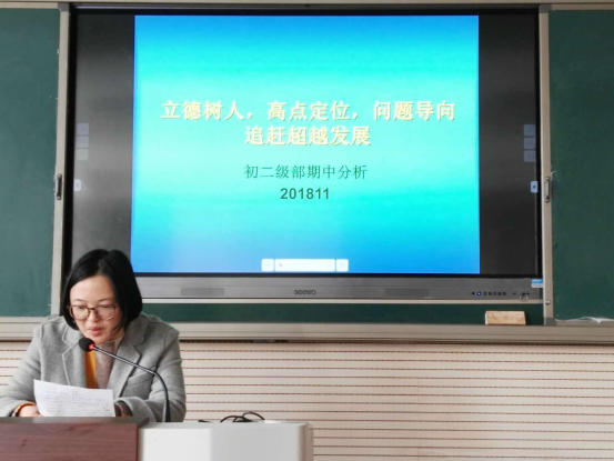 首先,各学科备课组长对本次考试和前期的教学做了详细的分析:立足改了什么、变了什么、做什么;接着,教务处郭继荣副主任从三个方面对本次期中考试做了科学、全面的数据分析:一、极点纷呈,数据实证级部质态优异;二、高点定位,问题导向追赶超越发展;三、多点发力,独特经验共推质量提升。政教处张建华主任从立德树人的角度,对分层走班背景下班级管理提出了具体要求;年级部周国圣主任从班级团队的建设、学生小题训练的跟踪等方面做了详细的指导;最后分管初二年级顾建兵副校长对本次期中考试分析会做了总结讲话:一、初二级部期中考试取得了历史性突破成绩,为大家点赞;二、初二级部这艘大船的航行,需要大家齐心协力,同舟共济;三、级部所有负责人将一如既往做好大家的服务。