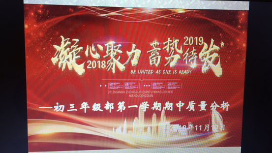 11月19日,初三年级部在二阶报告厅召开了2018--2019第一学期期中分析会,本次会议由初三年级组长郭桂庆老师主持,初三年级部的全体领导参加了会议,分别对初三年级的所有老师提出了要求。