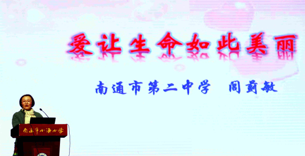 本次报告的主讲人是南通市第二中学的闾蓟敏老师,她作了题为《爱让生命如此美丽》的专题报告。闾蓟敏是江苏省第一个无偿捐献造血干细胞的中小学教师,她先后获得全国无偿捐献造血干细胞奉献奖、江苏省博爱奖章、省首届十佳师德模范等荣誉。有着特殊经历的闾老师真诚为人、踏实做事、传递幸福。从闾老师温情的语言中饱含着她对教师工作的热情,饱含着对学生浓浓的爱,生动的教育故事分享,更是诠释了她的教育理念。现场的老师们都被她的教育故事深深地吸引着、感动着。