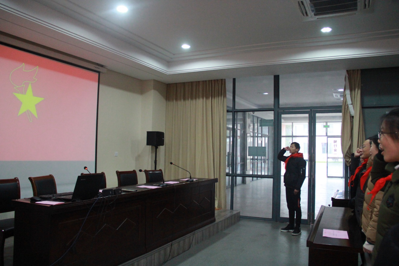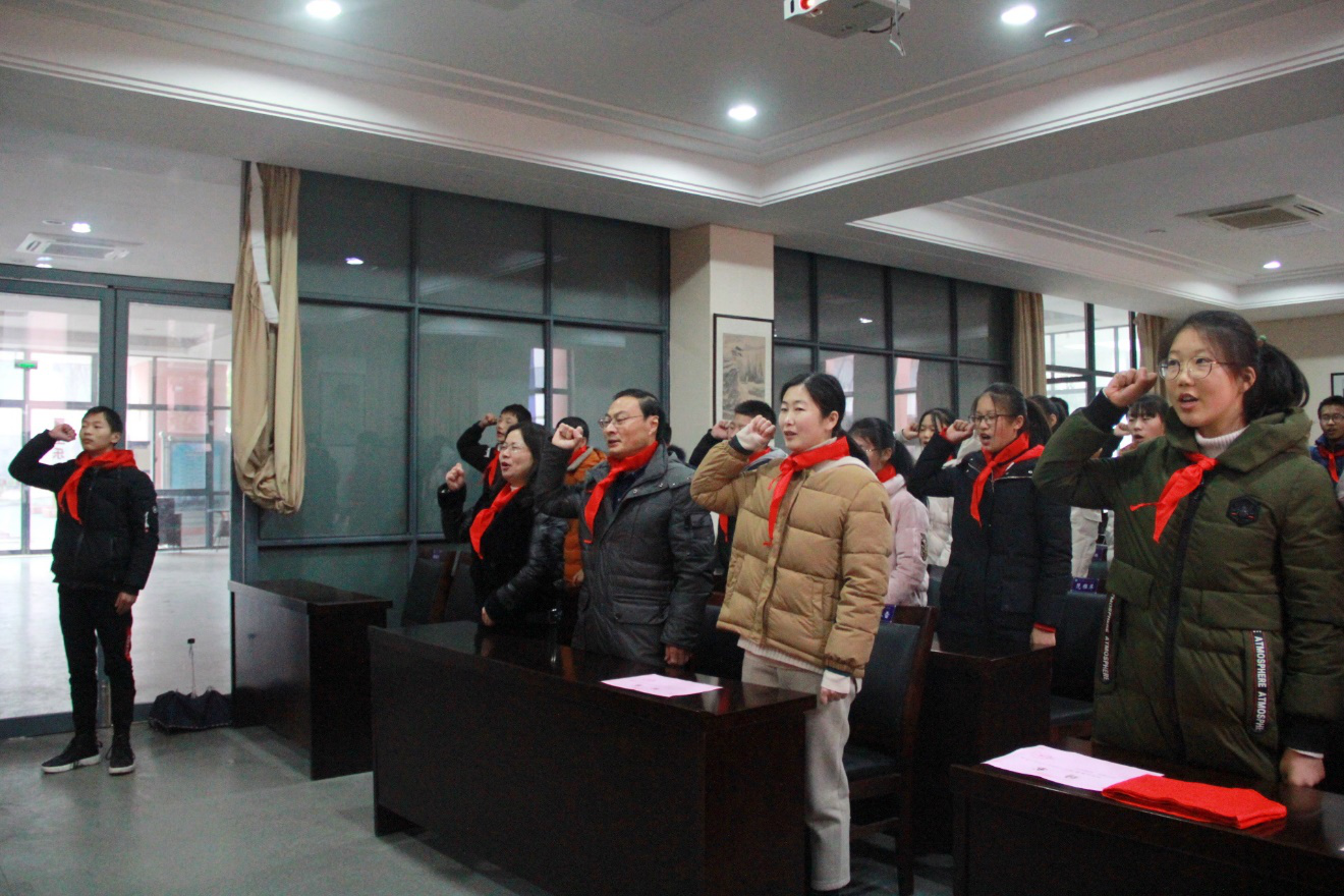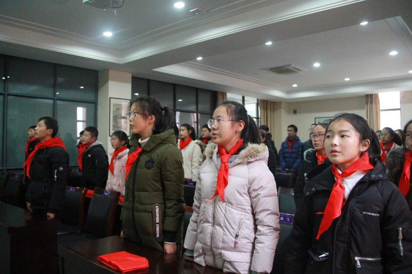 主持人宣布会议开幕后,全体与会代表起立高唱队歌,随后队员为出席会议的领导和辅导员老师佩戴了红领巾。