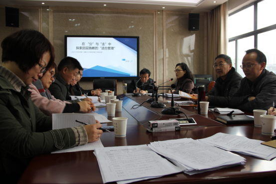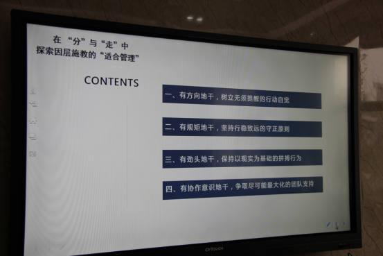 下午,郭小平副校长以《在 “分”与“走”中探索因层施教的“适合管理”》为题,从“有方向地干,树立无须提醒的行动自觉、有规矩地干,坚持行稳致远的守正原则、有劲头地干,保持以现实为基础的拼搏行为、有协作意识地干,争取尽可能最大化的团队支持”四个方面做了详细的汇报,突出了学校精细、精心、精致的管理思路。郭小平副校长指出,今后,我们将继续践行“东方表达”,“在劳力上劳心”,继续筑牢因层施教的“基础桩”、激活因层施教的“反应堆、奏响因层施教的“主旋律”。