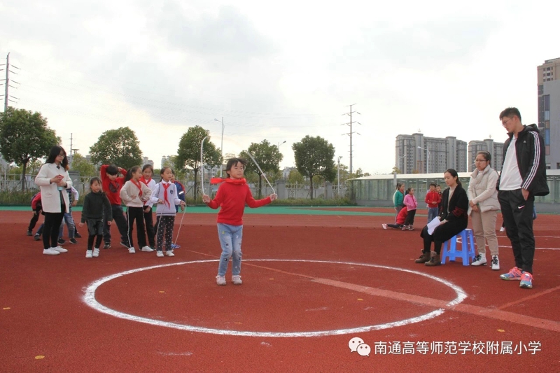 跳绳接力的赛场上小运动员们挥舞着充满力量的双臂,绳子化成美丽的圆圈,速度飞快,围观的老师们都竖起了大拇指。