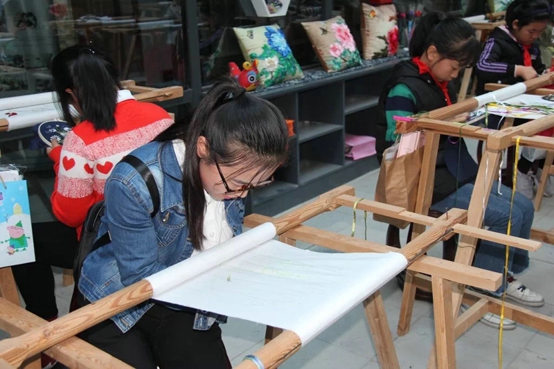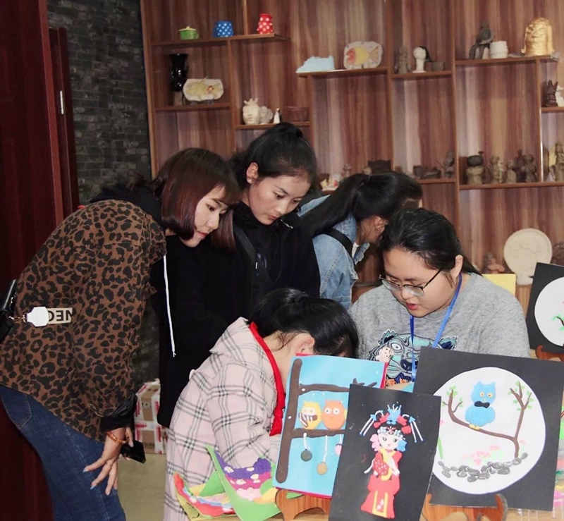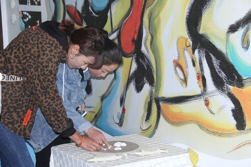 最后,师生们还饶有兴趣地观摩了我校选修课程展示。面塑、贝壳贴画、棕榈编制、梅庵琴社、女红传习……来自雪域高原的客人们对富有“南通味儿”的选修课程兴趣盎然,主动对话选修课的老师和孩子们并兴致勃勃地参与其中。