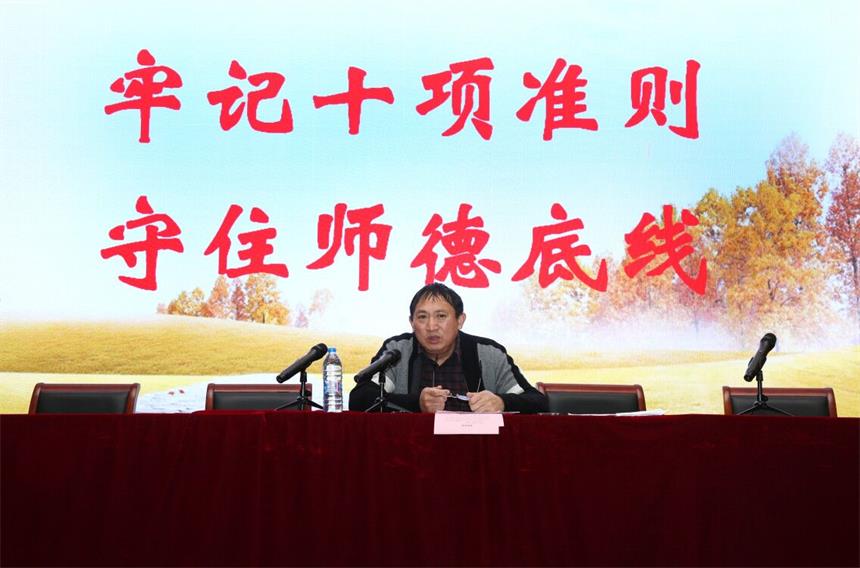 徐校长联系当今教育生态和社会舆情,结合教育部印发的《中小学教师违反职业道德行为处理办法(2018年修订)》,对“十项准则”作了详细解读。徐校长指出“十项准则”的制定,是新时代教师职业规范,是针对主要问题、突出问题划定的基本底线,是深化师德师风建设,造就政治素质过硬、业务能力精湛、育人水平高超的高素质教师队伍的关键之举。徐校长语重心长地告诫全体教师,要把教书育人和自我修养结合起来,时刻自重、自省、自警、自励,自觉,做以德立身、以德立学、以德施教、以德育德的楷模。徐校长要求全体教师要加强政治学习,领会政策精神,做“十项准则”的坚定执行者。