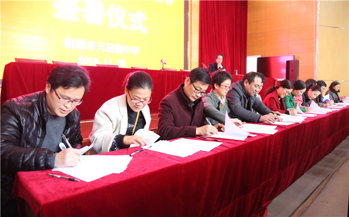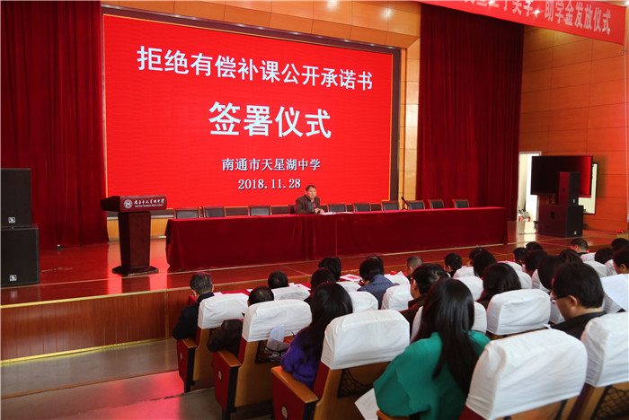 11月28日,根据《省教育厅关于开展拒绝有偿补课公开承诺活动的通知》文件精神,南通市天星湖中学召开了全体教职工大会,举行“拒绝有偿补课公开承诺书”签署仪式,以实际行动贯彻教育部颁发的新时代教师职业行为“十项准则”。
