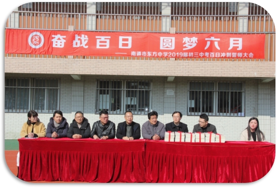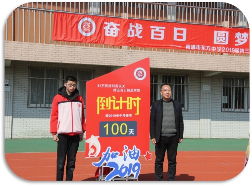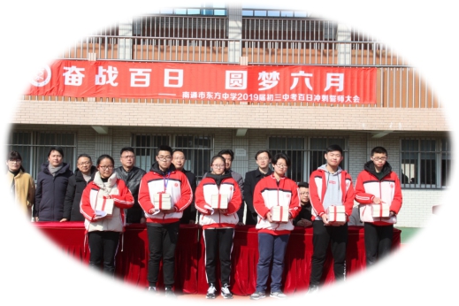 3月8日上午,南通市东方中学运动场,阳光明媚,春意盎然。我校2019届初三中考百日冲刺誓师大会隆重举行。校长戴继华、副校长蒋子平、顾建兵、陈黎明,校长办公室主任周国圣、教务处主任曹金花、政教处主任黄杰、总务处主任袁国等部门负责人和初三级部负责人以及初三全体师生、部分家长参会。