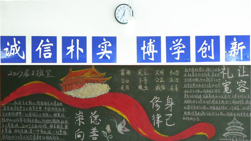为不断深化社会主义核心价值观教育,积极引导广大学生全面认识和正确理解“富强、民主、文明、和谐、自由、平等、公正、法治、爱国、敬业、诚信、友善”为基本内容的社会主义核心价值观,让社会主义核心价值观深入人心,永驻校园。3月21日,南通市天星湖中学开展了以“社会主义价值观”为主题的黑板报评比活动。
