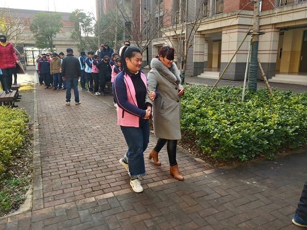 接下来,是“漫漫风雨路”主题活动。一曲《牵手》的旋律中,家长和孩子们戴好眼罩,手牵着手,一起向既定目标行进。在彼此的默契中,他们攻克了一道又一道“难关”,完成了一段又一段“历程”。这是一个相互理解、相互信赖的旅程,这又是一个相互支持、相互鼓励的旅程。活动中,家长和孩子动情地拥抱。