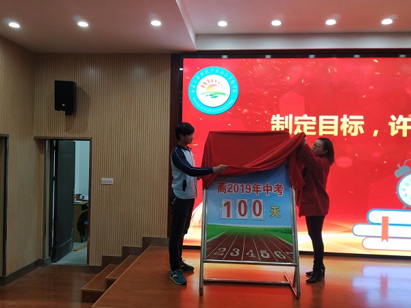 大会渐入高潮,陈晓燕老师和杨雨乐同学揭下中考百天倒计时牌的帷幕。中考一百天,真的来了,箭已在弦。九年级全体学生发出了战斗呐喊:“我们以青春的名义宣誓:我将用智慧培育理想,不负父母的期盼。我将用汗水浇灌希望,不负恩师的厚望。我将用信心铸就目标,不负青春的理想。珍惜一百天,让智慧闪光!拼搏一百天,让斗志昂扬!奋斗一百天,让梦想飞翔!”