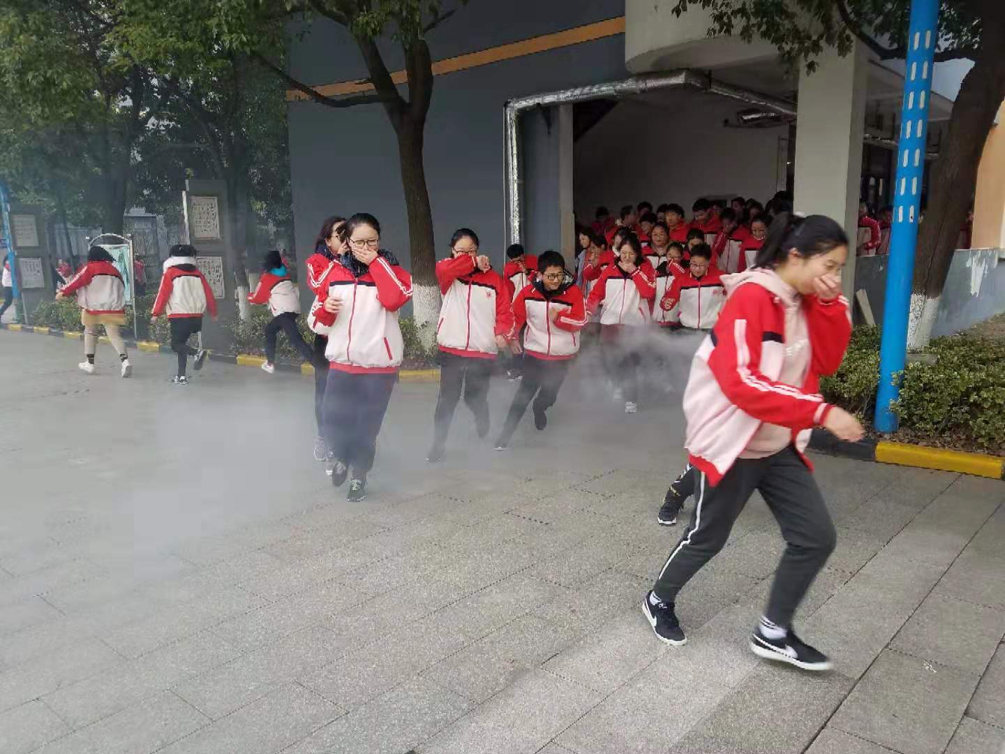 为了接下来的一遍演练更具有真实感,体育组的符红军老师根据年级组的要求,在学生疏散的几个路口分别燃放了烟幕,第二遍演练比第一遍更为迅速、有序。