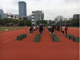 上午第四课为第一类的三个内容,分别是快速跑、立定三级蛙跳和助跑正面双手头上前掷实心球。