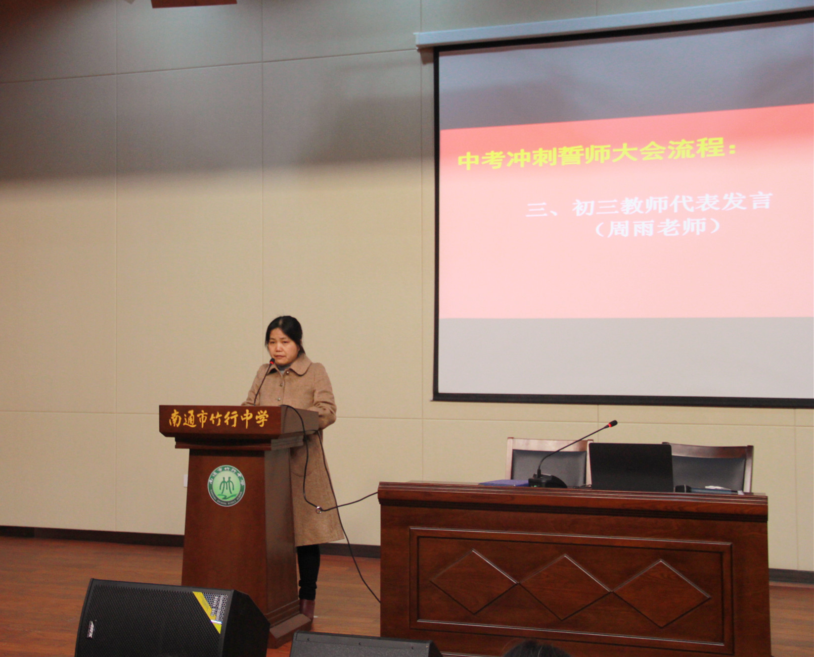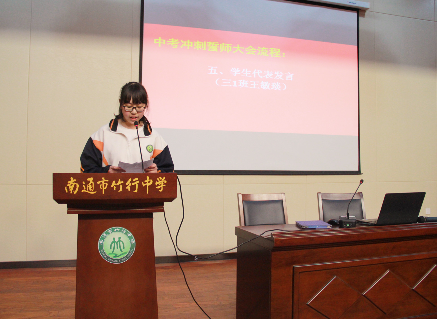 学生代表初三(1)班王敏琰同学的发言则表达出了所有同学的愿望和决心,挑战人生是同学们坚定的信念,决胜中考更是同学们的不懈追求。