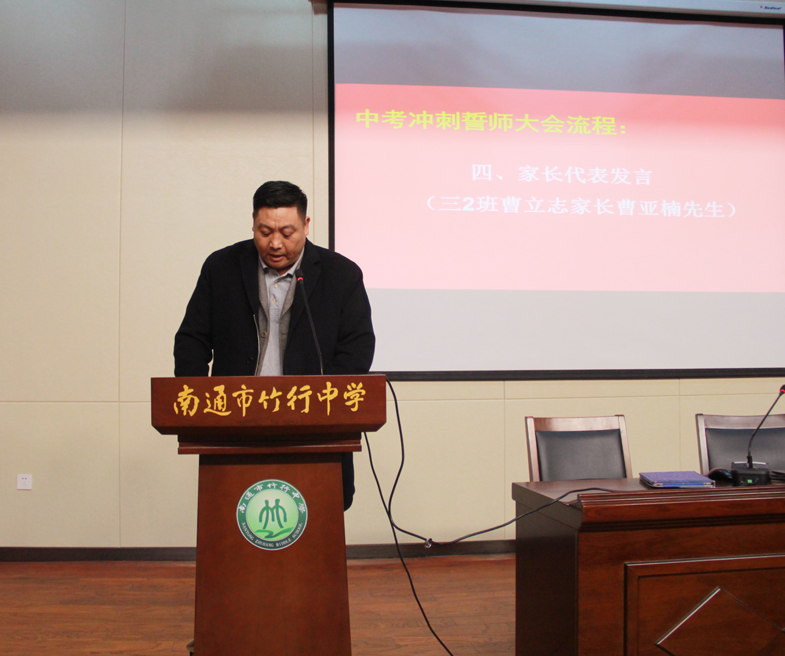 大会的第四个议程,初三(2)班曹立志家长曹亚楠先生在讲话中对全体初三教师表达诚挚的感谢,向初三的学子们致以美好的祝愿,并提出“愿意和孩子一起学习,一起成长,一起冲刺中考”。