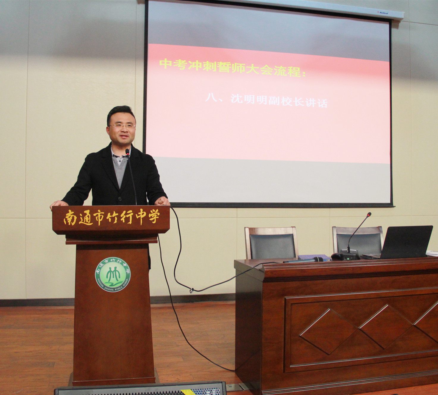 大会的最后一项议程,沈明明副校长发表了激情洋溢、振奋人心的动员讲话。沈校长用“目标、信念、认真、效率、超越”这五个词激励全体学生,用汗水践行誓言,用拼搏实现梦想,凭借勤奋与努力不断超越自己,在六月为自己的父母和老师交上一份满意的答卷,与学校共享成功的喜悦。