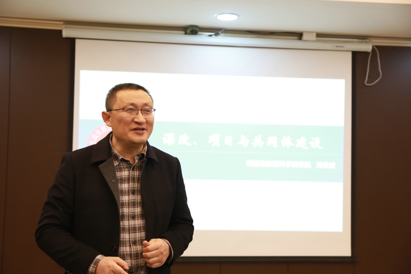 本次推进会聚焦“前瞻性教学改革实验项目”。上午9点半,参会的专家领导、校长、园长在会议室召开专题会议。会上,南通市教育科学研究院理论科科长周荣斌作了《课改,项目与共同体建设》的专题讲座。帅宁华校长作题为《前瞻引领:大生课堂建设助推器》的专题报告。