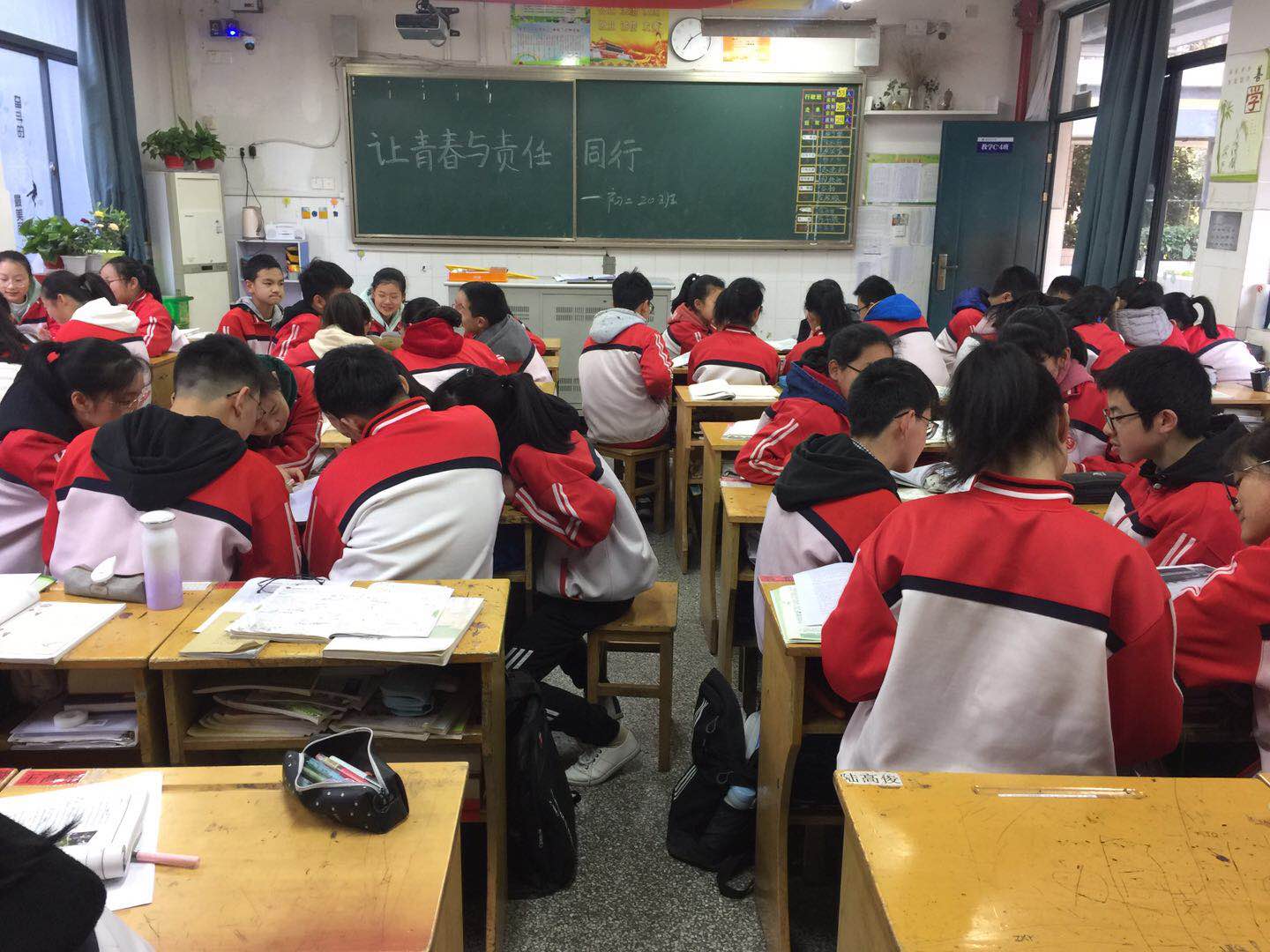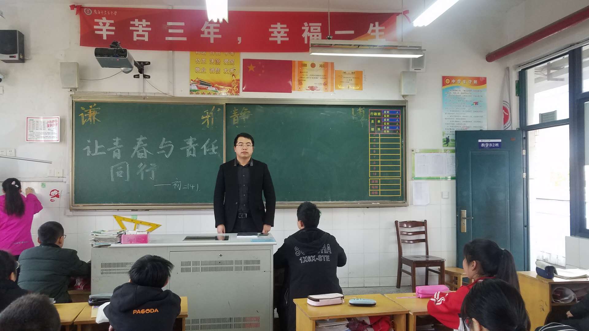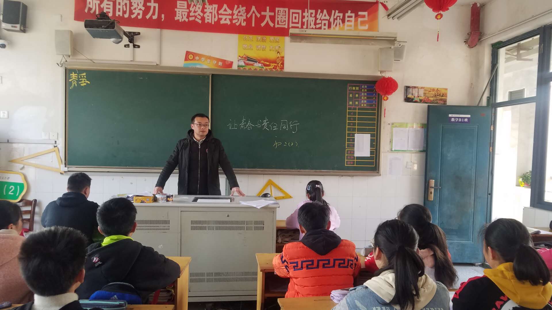 班会课即将结束,全班提出倡议书:《做一个有责任心、有正义感的中学生》。