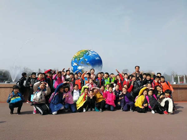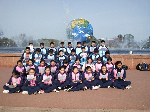 一二年级的孩子们,跟随舞动的喷泉跃跃欲试,看到大大的地球仪在水中央,按捺不住激动的心情,跟着老师,跟着音乐一起唱:“春天在哪里呀,春天在哪里,春天在那小朋友的眼睛里……”童声稚嫩,伴着春姑娘的杨柳辫随风飘扬。