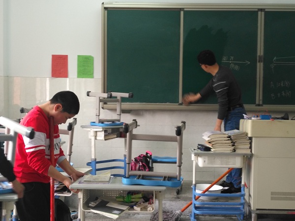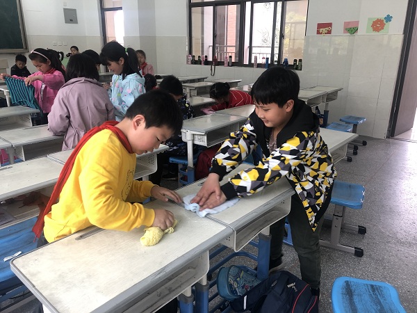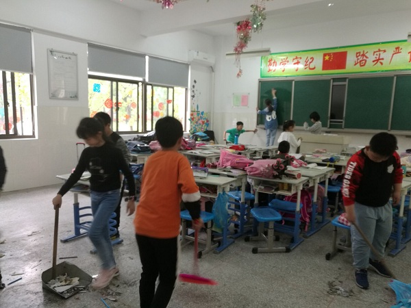 活动中,班主任对本班学生做了具体明确的分工,全体教职员工齐动手,亲自示范、指导,始终与学生在一起参加劳动。整整一节课的时间,老师和同学们个个热情高涨,不怕脏累,有的拿扫帚、拖把清扫室内外的垃圾,有的拿着抹布站在桌子上擦洗平时不易触摸到的卫生死角,有的负责扫除教学楼的蜘蛛网。经过全校师生的共同努力,校园的环境卫生得到改善,校园面貌焕然一新。