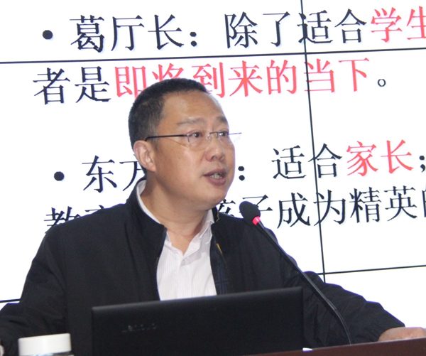经验交流环节,戴继华校长作了《构建“分层走班”之“东方表达”》专题报告,报告从宏观理念、微观操作的角度,向来访专家和领导介绍了学校“分层走班”的教学经验,具体介绍了我校坚持“分层走班”教学改革,努力办适合的教育,一直坚持选择、实践、再选择、再实践,经过反复地尝试直至找到“适合的教育”。“让教育适合学生”在东方中学不仅仅是一种口号,先行先试的实际行动诠释了“适合的教育才是最好的教育”这样一个朴素的道理。