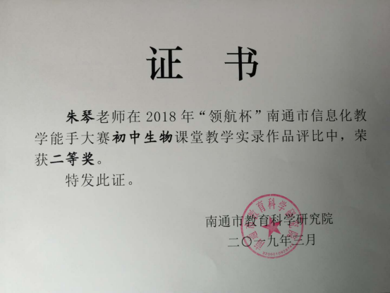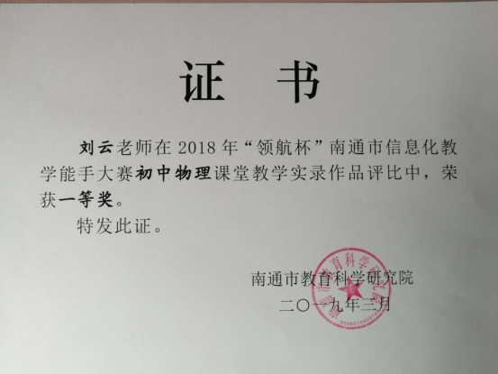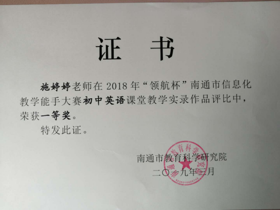 日前,“领航杯”2018年江苏省信息化教学能手比赛圆满结束,比赛结果随之揭晓。我校教师在省、市“领航杯”信息化教学能手大赛中喜获佳绩,刘云老师获省三等奖,刘云、施婷婷老师获南通市一等奖,朱琴老师获南通市二等奖。
