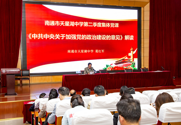 南通市天星湖中学第二季度全体党员党课5月13日下午在学校滋兰楼报告厅举行,学校所有党员同志参加了本次党课学习,由学校党委副书记葛红军同志组织授课,葛书记就《中共中央关于加强党的政治建设的意见》向全体党员进行了解读,要求大家首先要把握《意见》的主要特点:突出政治性、系统性、统领性和针对性;其次要明确《意见》的主要任务:要坚定政治信仰、要强化政治领导、要提高政治能力、要净化政治生态;第三部分葛书记就如何贯彻落实提出了明确要求,要求全体党员同志要落实领导责任,抓住关键少数,强化制度保障,加强监督问责。之后葛书记结合习总书记3月18日在学校思想政治理论课教师座谈会上的重要讲话精神,给学校思政课老师提出了具体要求。