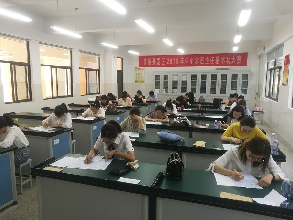 大赛分为小论文评选、笔试和面试三个部分。笔试环节要求参赛选手在规定时间内,完成班主任日常工作中涉及到的教育学、心理学、法律法规、近期时政等相关基础知识题以及当下热点问题的论述题,以此考查班主任管理班级的理论知识水平,检验班主任育人艺术和策略。考试中,考场考风严谨,班主任们结合自己的理论知识与实践经验,认真答题。