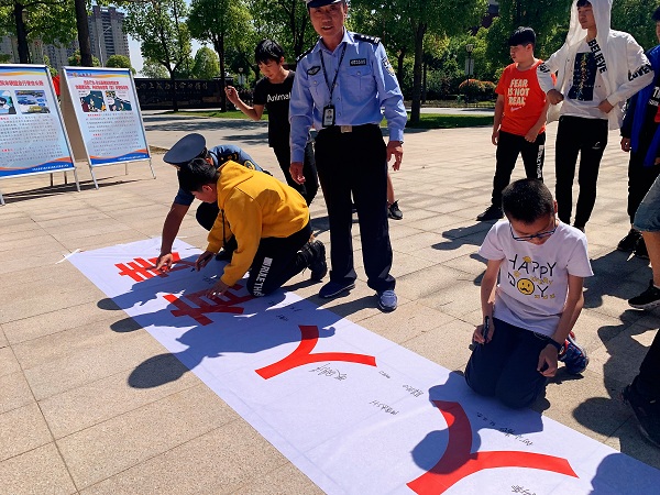 法制安全教育讲座后,学生纷纷在横幅上签下自己的名字,努力成为遵法守法、爱路护路的重要一员,让法制安全护航园区孩子健康成长。