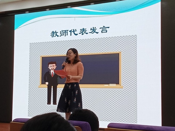 教师代表陈晓燕发言,她深情款款地回顾了学生们三年的成长,大家仿佛又回到了昨日的课堂。她的讲话中有赞美,有鼓励,更有期待。最后,陈老师表达了美好的期望,祝愿同学们前程似锦、一帆风顺!