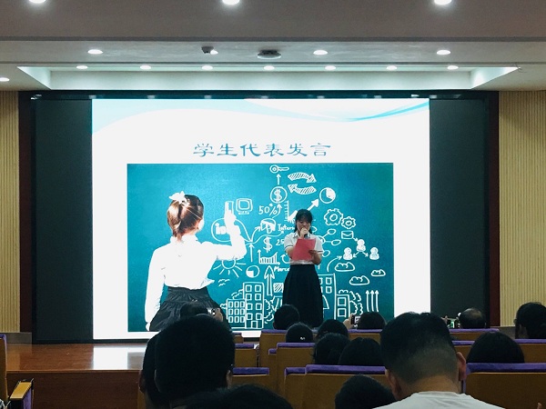 九年级1班马丹丹同学代表全体学生发言,她回忆了初中三年和老师、同学共度的美好时光,表达了对母校的感谢和对辛勤培育自己的老师的敬意。
