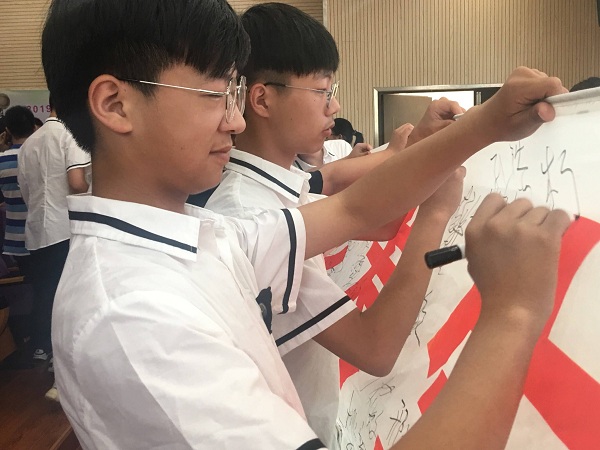 最后,初三年级全体师生在签名墙上庄严地签上自己的名字——学校不会忘记,2019年,有一群积极进取、朝气蓬勃的学生毕业了,他们是学校的骄傲!