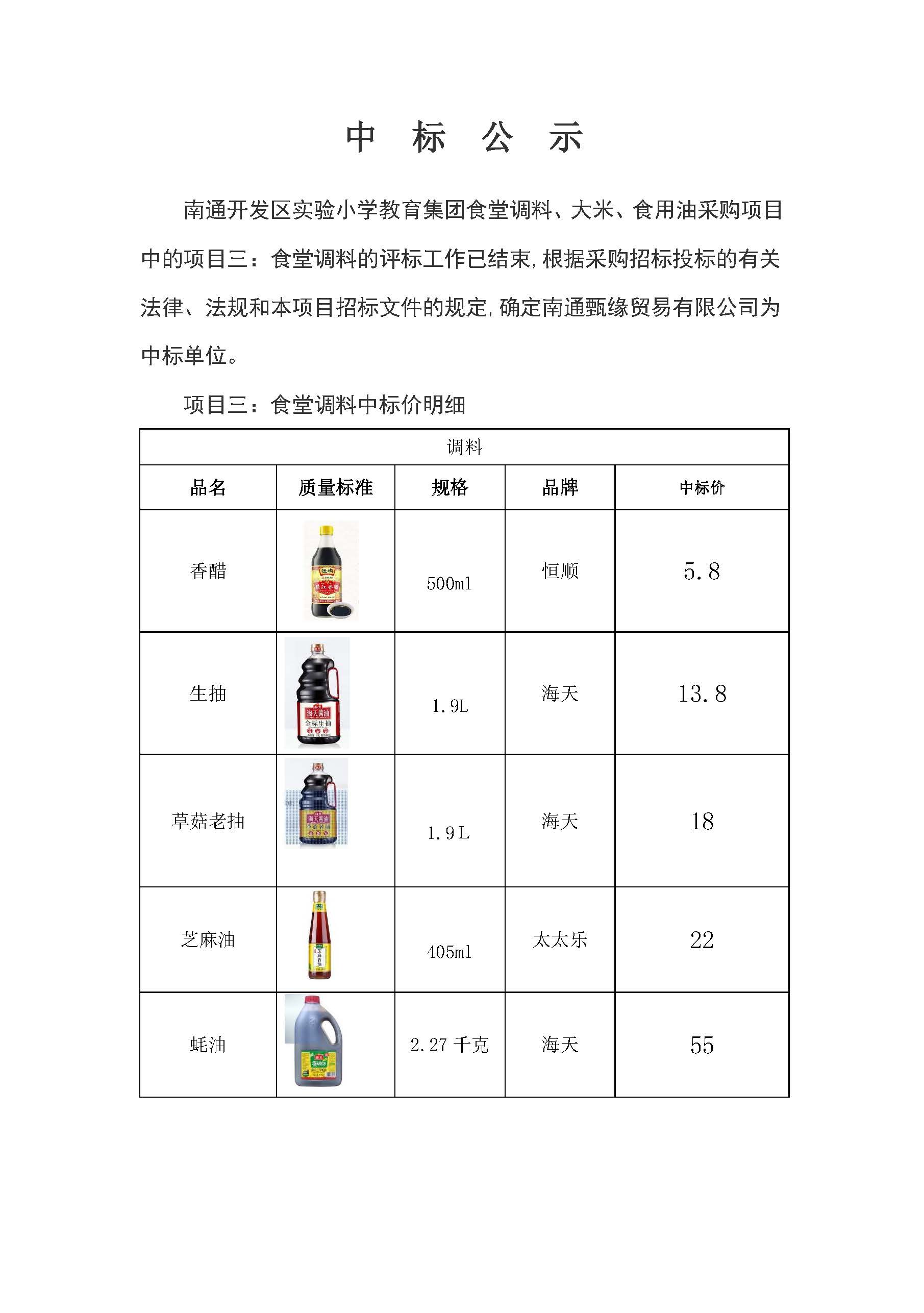 南通开发区实验小学教育集团食堂调料、大米、食用油采购项目中标公示