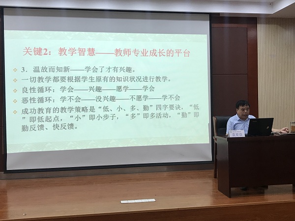袁老师从教师的专业化发展、教师发展的核心、教师成长的六大关键三个方面,娓娓道来,深入浅出地为我们讲述了如何进行专业方面的提升。袁老师的讲座有理有据,案例详实,让人不知不觉中就收获良多。